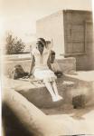Fotografía en exterior de una mujer sentada en una banca de material, lleva un traje de tenista, tiene una raqueta y una banda en la cabeza. Hay dos niños cerca de ella. Imagen en álbum 1.