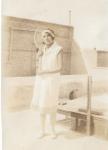 Fotografía en exterior de una mujer de pie, vestida de blanco, con una banda en la cabeza y una raqueta de tenis. Imagen en álbum 1.