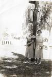 Fotografía en exterior de dos mujeres recargadas en un poste eléctrico. Imagen en álbum 1.