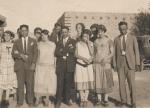 Fotografía de un grupo de personas en trajes formales, algunos traen confeti en el cabello y ropa. Se encuentran al frente de una edificación con apariencia de adobe. Imagen en álbum 1.
