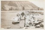 | Fotografía de una mujer, de pie y sonriente, a la orilla de un río. Al fondo se observan montañas. En la parte posterior un sello de "Dingler Torreón".