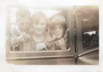 Una joven y dos hombres se asoman por la ventada de un automóvil o camión, adentro de éste se observan más personas. Imagen en álbum 1.