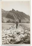 | Una pareja (hombre y mujer) caminan sobre un trayecto de piedras que se encuentra en medio de un río. Al fondo se observa una montaña. La imagen tiene al reverso el sello de "Dingler", Torreón.