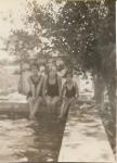 Dos jóvenes y una niña en traje de baño, sentadas en el borde de una alberca o noria. A su costado se observan árboles y al fondo una edificación. Probablemente se encuentren en el entorno de la Comarca Lagunera. Imagen en álbum 1.