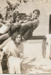 Dos jóvenes y dos niñas en traje de baño, sentadas en un poste redondo, una atrás de la otra y recargándose todas hacia atrás, como jugando. Delante de ellas una mujer con vestido. Imagen en álbum 1.