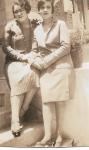 | Dos mujeres, con trajes formales, observan a la cámara. Se encuentran recargadas en un pequeño muro y sus pies se apoyan en unas escaleras. La mujer que aparece en primer lugar, de derecha a izquierda, también está en la fotografía d62, con el mismo traje y en el mismo lugar.