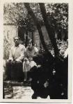 Fotografía en exterior, en espacio arbolado, de un hombre y una mujer sentados sobre el borde de una fuente. Imagen en álbum 1.