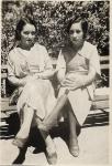 Fotografía de dos mujeres sentadas en una banca, al fondo se observa vegetación. Se encuentran al aire libre. Imagen en álbum 1.