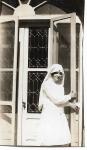 Fotografía de una mujer, quizá una monja o una enfermera. Abre una puerta, como si estuviera saliendo del lugar. Imagen en álbum 1.