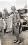 Fotografía de una joven sonriente, frente a un automóvil. Atrás de ella un hombre joven, con botas y sombrero, parece dialogar con una joven o niña. Imagen en álbum 1.
