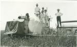| Fotografía en papel postal AZO de un grupo de personas sobre una maquinaria. En la parte posterior dice: "Trillando trigo en la Hda. Cuba". A lápiz dice: 1925-1926. |