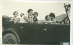 | Seis jóvenes en un automóvil. En la parte posterior se indica: "Muchachas laguneras alrededor del año 1926 o 27". Se mencionan los nombres de dos de ellas.